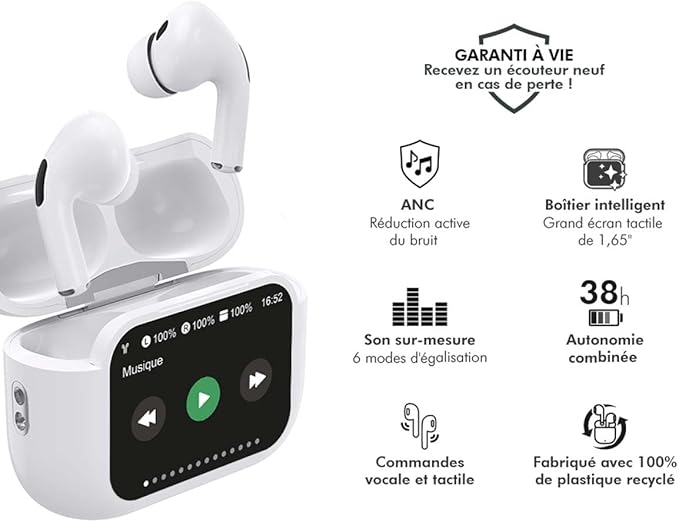 38 heures d'autonomie Restez connecté toute la journée sans devoir recharger constamment. Idéal pour les déplacements, les sessions de sport prolongées ou une journée de travail complète avec appels et musique. Boîtier de charge intelligent équipé d'un grand écran tactile de 1,65" Equipé d'un grand écran tactile intuitif, il vous permet de contrôler facilement les fonctions cruciales : écouter de la musique, gérer les appels, activer le mode anti-bruit, ajuster le volume, l'égaliseur, vérifier le niveau de batterie, et bien plus. Vous pouvez personnaliser votre usage en modifiant des paramètres tels que la luminosité et le fond d'écran. ANC Cette technologie de réduction active du bruit élimine les sons indésirables de l'environnement. L'ANC assure une immersion totale pour savourer chaque note de votre musique. Elle est aussi parfaite pour les appels, vous permettant de vous concentrer sur votre interlocuteur même dans des lieux bruyants. Commandes faciles Bénéficiez d'un contrôle simplifié grâce aux commandes tactiles et vocales. Que ce soit pour ajuster le volume, changer de piste ou lancer vos playlists favorites, tout est accessible d'un simple geste ou par commande vocale Siri et Google Assistant. Résistants aux éclaboussures et à la transpiration Nos écouteurs, résistants à l'eau, à la pluie et à la sueur, conviennent parfaitement à un mode de vie actif ou sportif. Ils sont l'accompagnement idéal pour le travail comme pour les loisirs, sans craindre l'eau ni la transpiration ! Connexion ultra rapide La technologie sans fil Bluetooth 5.3 garantit une connexion à la fois rapide et stable. Après une mise en place aisée, vos écouteurs sans fils s'activent automatiquement. Il vous suffit de les sortir de leur boîtier pour qu'ils se connectent instantanément à votre appareil, vous offrant ainsi une qualité sonore optimale. 3 tailles d'embout en silicone fournies Pour s'adapter parfaitement à vos oreilles. Profitez d'une meilleure isolation sonore, d'un confort incroyable et d'un maintien sûr pour une expérience auditive idéale. Quelle que soit la taille de vos oreilles, nos écouteurs sont conçus pour vous convenir parfaitement. Un son sur-mesure Choisissez parmi 6 modes d'égalisation (Jazz, Vocal, Bass, Club, Studio, Standard) et profitez d'un son parfaitement adapté à vos envies.