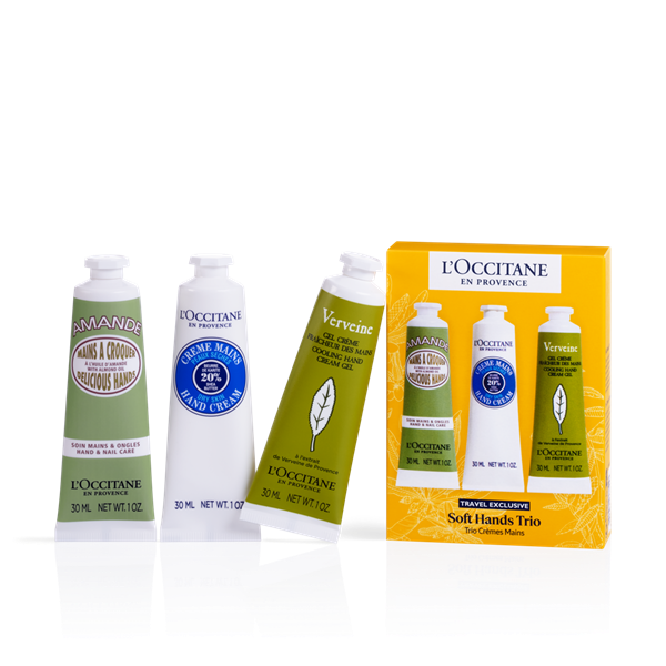 Découvrez nos incontournables crèmes mains dans ce trio exclusif de voyage. Elles protègent et nourrissent vos mains tout en les enveloppant de délicieuses senteurs : Amande gourmande, Karité réconfortant ou Verveine rafraîchissante. Les compagnons parfaits pour votre sac à main !